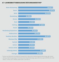 Zu den vielen Unwuchten im sächsischen Besoldungssystem gehört u.a. die schlechtere Bezahlung von jungen Beamtinnen und Beamten im Bundesvergleich wie auch jüngst der DGB-Besoldungsreport 2025 gezeigt hat (siehe Grafik auf der nächsten Seite am Beispiel der Besoldungsgruppe A7). Der vom Bundesverfassungsgericht geforderte Mindestabstand zur Grundsicherung ist akut gefährdet, auch weil die sächsische Besoldung gerade in der Eingangsstufe im Ländervergleich ziemlich schlecht dasteht.