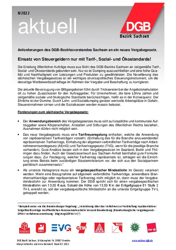 Die DGB-Gewerkschaften hatten am 12.07.2022 Anforderungen an ein neues Vergabegesetz veröffentlicht.