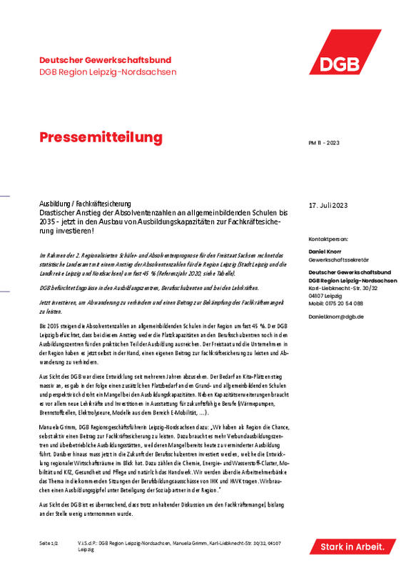 Bis 2035 steigen die Absolventenzahlen an allgemeinbildenden Schulen in der Region um fast 45 %. Der DGB Leipzig befürchtet, dass bei diesem Anstieg weder die Platzkapazitäten an den Berufsschulzentren noch in den Ausbildungszentren für den praktischen Teil der Ausbildung ausreichen. Der Freistaat und die Unternehmen in der Region haben es jetzt selbst in der Hand, einen eigenen Beitrag zur Fachkräftesicherung zu leisten und Abwanderung zu verhindern.