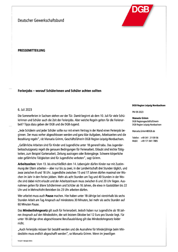 „Auch Ferienjobs müssen fair bezahlt werden und die Ausnahme für Minderjährige beim Mindestlohn muss endlich abgeschafft werden“, so Manuela Grimm. Wenn im jeweiligen Unternehmen aber ein durch Gewerkschaften verhandelter Tarifvertrag gilt, muss der auch bei Minderjährigen angewendet werden. Beim Unterschreiben des Arbeitsvertrages sollte man das ganz besonders im Blick haben.“