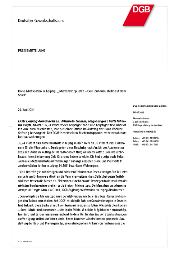 „Viele Beschäftigte mit niedrigen und mittleren Einkommen müssen einen großen Teil ihres erarbeiteten Einkommens direkt an die Vermieter weiterreichen. Selbst bei guten Tarifabschlüssen fressen die Mieten die Einkommen zunehmen auf. Deswegen fordern wir von der nächsten Bundesregierung einen sechsjährigen Mietenstopp. Die Menschen brauchen eine Atempause“ sagte Manuela Grimm, DGB-Regionsgeschäftsführerin Leipzig-Nordsachsen.