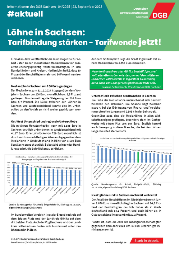 Die Kurzinformation steht hier zur Verfügung: Kurzinformation #aktuell - Löhne in Sachsen: Tarifbindung jetzt stärken!