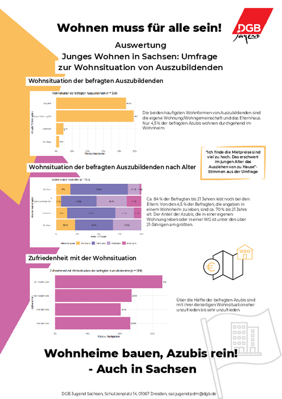 Markus Schlimbach, Vorsitzender des DGB Sachsen ordnet die Ergebnisse ein: „Die Umfrage der DGB-Jugend zeigt, welche Herausforderungen eine neue Regierung in Sachsen auf dem Wohnungsmarkt lösen muss, um die Wohnsituation von Auszubildenden zu verbessern. Es ist alarmierend, dass Auszubildende fast die Hälfte ihrer Ausbildungsvergütung ausgeben müssen, wenn sie in einer WG oder einer eigenen Wohnung leben wollen. Es ist nachvollziehbar, dass junge Menschen mit Beginn einer Ausbildung in ein eigenständiges Leben starten wollen, zumal der Ausbildungsort nicht immer der vorherige Wohnort ist. Diese Möglichkeit bleibt besonders jenen mit wenig Geld in Sachsen verwehrt. Hier muss die neue Regierung aktiv werden, indem bezahlbare Wohnangebote für Auszubildende geschaffen werden. Das ist auch für die Verbesserung der Attraktivität der Dualen Ausbildung in Sachsen enorm wichtig.“